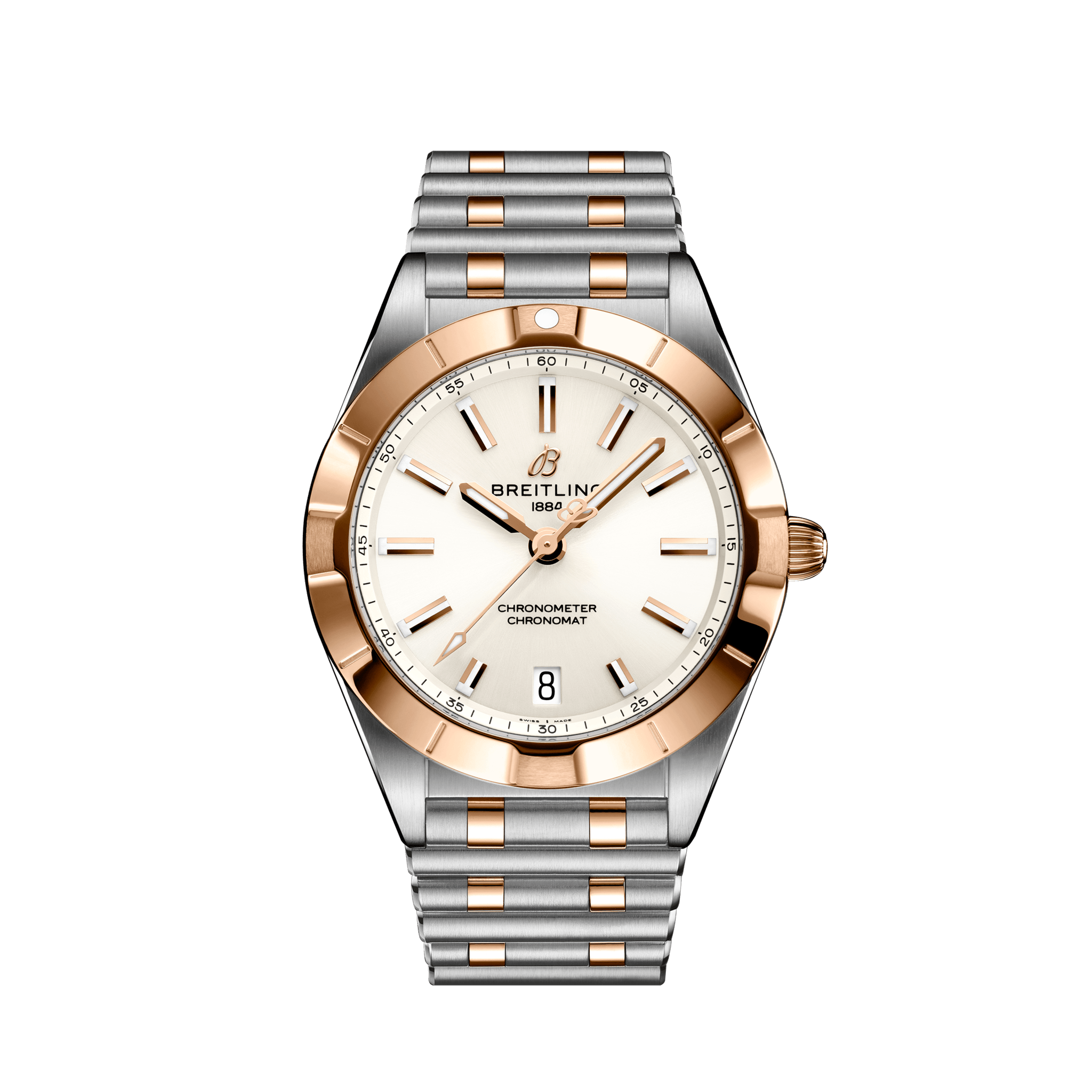 Erhältlich bei Juwelier Seilnacht in Freiburg: Die Breitling Chronomat 32 (Ref. U77310101A1U1) ist eine elegante Damenuhr, die klassische Ästhetik mit moderner Technik vereint. Das 32 mm große Gehäuse aus Edelstahl und 18-karätigem Rotgold beherbergt ein silberfarbenes Zifferblatt mit goldfarbenen Zeigern und Indizes. Die charakteristische “Rouleaux”-Armbandgestaltung mit Butterfly-Faltschließe sorgt für hohen Tragekomfort und unterstreicht das luxuriöse Design.