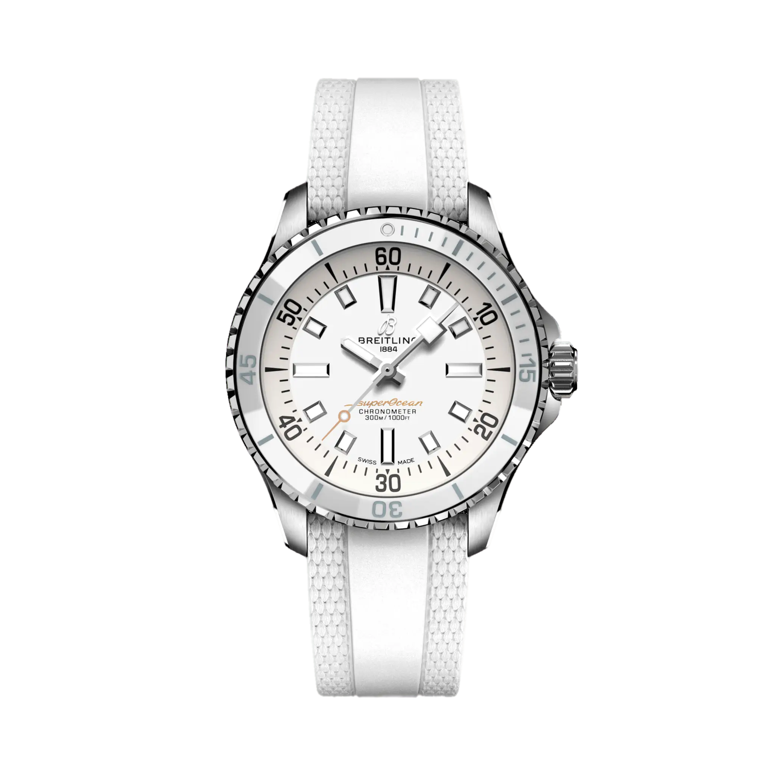 Erhältlich bei Juwelier Seilnacht in Freiburg: Die Breitling Superocean Automatic 36 ist eine elegante und zugleich robuste Taucheruhr, die für ihre Zuverlässigkeit und Präzision geschätzt wird. Das 36-mm-Edelstahlgehäuse beherbergt das automatische Breitling-Kaliber 17 mit einer Gangreserve von ca. 38 Stunden. Das weiße Zifferblatt mit leuchtenden Indizes und Zeigern sorgt für optimale Ablesbarkeit, während die einseitig drehbare Lünette mit Keramikeinlage zusätzliche Sicherheit beim Tauchen bietet. Das weiße Kautschukarmband mit Faltschließe ermöglicht einen hohen Tragekomfort und ist ideal für den Einsatz im Wasser geeignet. Mit einer Wasserdichtigkeit von bis zu 300 Metern ist diese Uhr der perfekte Begleiter für Wassersportliebhaber und stilbewusste Träger gleichermaßen.