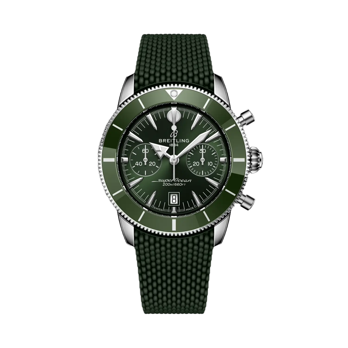 Je nach Ausführung ist die Uhr mit einem grünen Kautschukarmband oder einem Edelstahl-Armband erhältlich. Beide Varianten haben eine Faltschließe zur sicheren Befestigung. Die Superocean Heritage B01 Chronograph 42 ist ein vielseitiger Begleiter – kraftvoll, elegant und funktional unter Wasser wie über der Oberfläche.