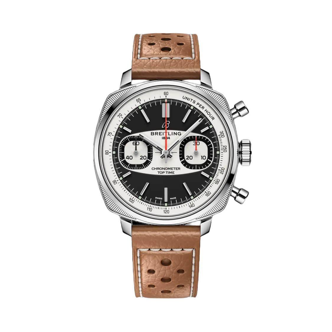 Erhältlich bei Juwelier Seilnacht in Freiburg: Die Breitling Top Time B01 Racing (Ref. AB01771A1B1X1) ist eine Hommage an die legendären Rennchronographen der 1960er Jahre und verbindet Retro-Charme mit moderner Uhrmacherkunst. Das 38 mm große Edelstahlgehäuse in Kissenform beherbergt ein schwarzes Zifferblatt mit dem charakteristischen Surfboard-Motiv und silberfarbenen Squircle-Totalisatoren, inspiriert von klassischen Armaturenbrettern. Angetrieben wird die Uhr vom hauseigenen COSC-zertifizierten Manufakturkaliber Breitling 01 mit automatischem Aufzug, das eine Gangreserve von ca. 70 Stunden bietet. Die Uhr verfügt über eine Chronographenfunktion mit 1/4-Sekunden- und 30-Minuten-Zähler. Ein beidseitig entspiegeltes, gewölbtes Saphirglas schützt das Zifferblatt, während der verschraubte Gehäuseboden aus Edelstahl die Gravur One of 750 trägt, da die Uhr auf 750 Exemplare limitiert ist. Die Uhr ist bis zu 100 Meter wasserdicht und wird an einem braunen perforierten Kalbslederarmband mit Dornschließe getragen.