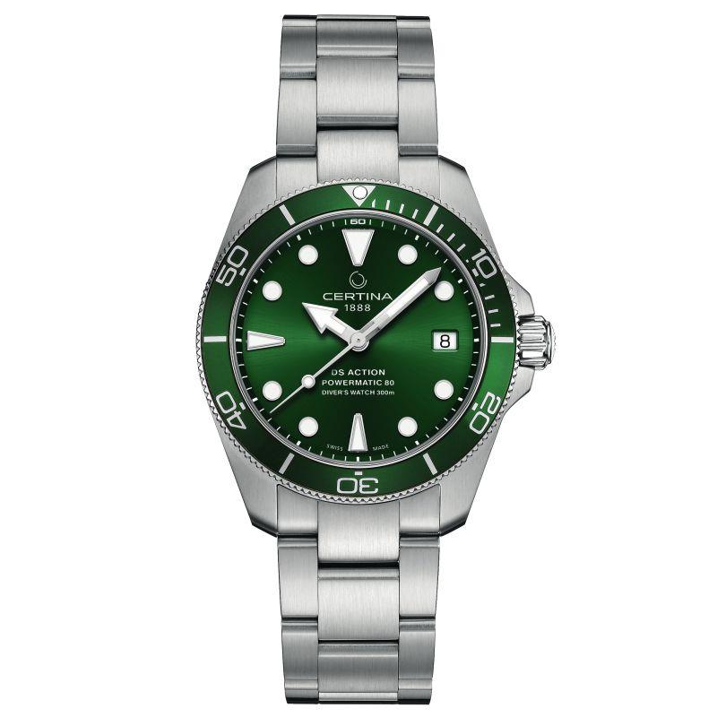 Die Certina DS Action Diver 38?mm Powermatic?80 beeindruckt als kompakter, sportlicher Taucherklassiker im modernen Gewand. Ihr feingeschliffenes Edelstahlgehäuse mit 38?mm Durchmesser (nur ca.?12,2?mm hoch) sitzt besonders harmonisch am Handgelenk und vermittelt solide Robustheit bei zeitloser Eleganz. Das tiefgrüne Zifferblatt mit Sonnenstrahl-Finish wirkt lebendig und klar. Applizierte, großzügig mit Super-LumiNova beschichtete Indizes und Zeiger gewährleisten im Dunkeln beste Ablesbarkeit ideal ergänzt durch die einseitig drehbare Taucher-Lünette mit Aluminiumring. Die Uhr glänzt technisch durch das automatische Kaliber Powermatic?80.611 mit großzügiger 80-Stunden-Gangreserve und Nivachron-Spiralfeder besonders widerstandsfähig gegenüber Magnetfeldern, Stößen und Temperaturschwankungen. Mit ISO 6425-Zertifizierung und 300?Meter Wasserdichtigkeit meistert sie zuverlässig jede Herausforderung unter Wasser, unterstützt von Certinas DS-Konzept (Double Security) mit verstärktem Saphirglas, verschraubter Krone und Gehäuseboden. Das robuste Edelstahlarmband mit Faltschließe inklusive Diver-Extension bietet Komfort und Sicherheit eine perfekte Kombination aus Funktionalität und sportlicher Ästhetik.