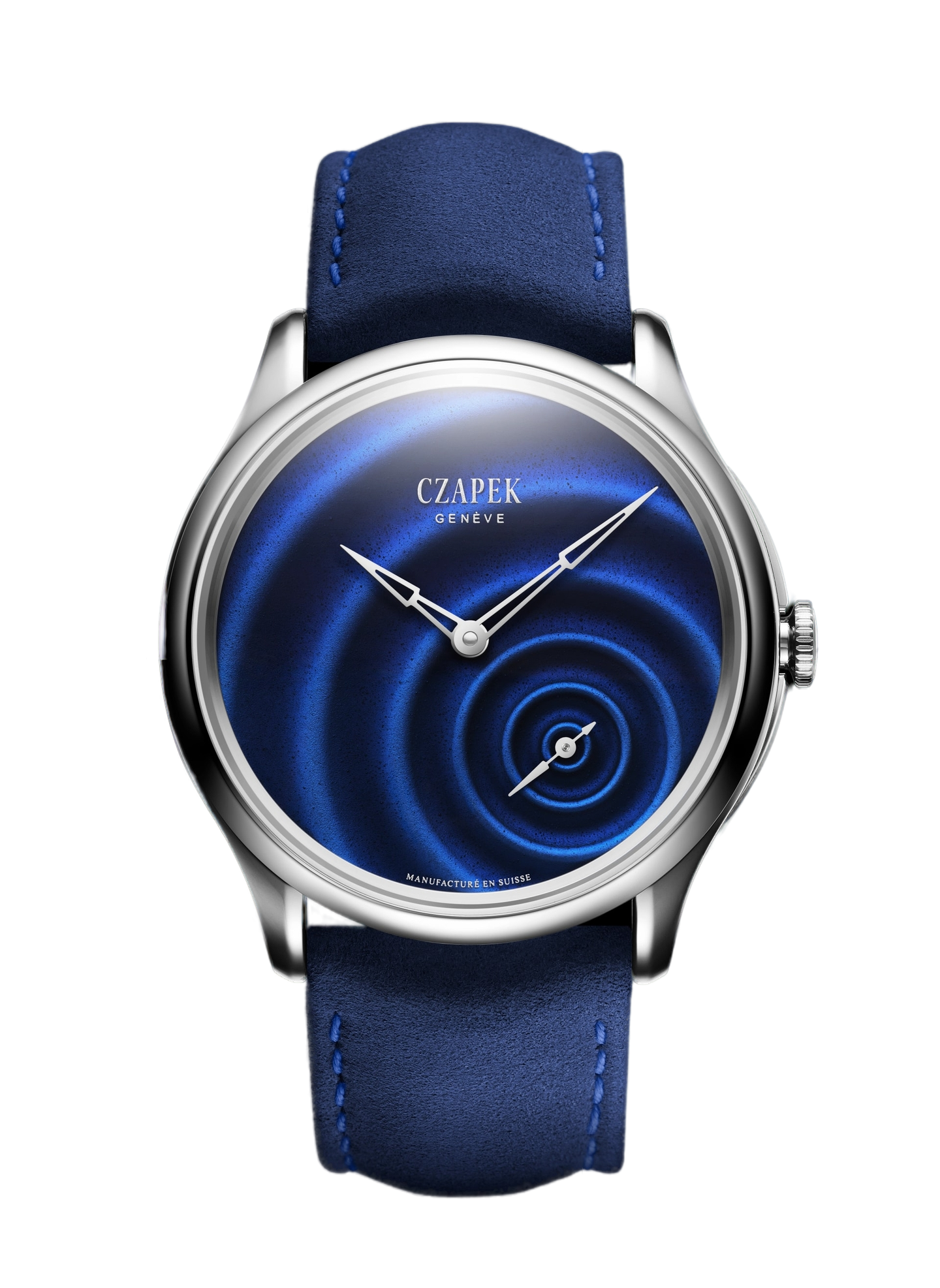 Czapek & Cie Promenade Goutte dEau Zeitlose Eleganz trifft auf höchste Uhrmacherkunst Die Promenade Goutte dEau von Czapek & Cie ist eine Hommage an fließende Formen und exklusive Handwerkskunst. Ihr tiefblaues Emaille-Zifferblatt fasziniert mit einem einzigartigen Wellenmuster, das das Licht auf elegante Weise einfängt und in immer neuen Nuancen schimmern lässt. Die auf 100 Exemplare limitierte Edition macht dieses Modell zu einem besonderen Sammlerstück. Das 38 mm große Edelstahlgehäuse rahmt das kunstvolle Zifferblatt und wird durch applizierte Indizes sowie schlanke Zeiger ergänzt. Unter dem entspiegelten Saphirglas entfaltet sich die besondere Tiefe des blauen Emails, das in einem aufwendigen Verfahren gefertigt wird und jedem Modell einen einzigartigen Charakter verleiht. Im Inneren arbeitet das Czapek SXH5.1 Automatikwerk mit Mikrorotor aus recyceltem Platin. Mit einer Frequenz von 4 Hz (28.800 VpH) und einer beeindruckenden Gangreserve von 60 Stunden garantiert es höchste Präzision und Zuverlässigkeit. Die offene Werkstruktur mit sandgestrahlten schwarzen Brücken und von Hand anglierte Kanten unterstreicht die Exklusivität dieses Zeitmessers. Die Promenade Goutte dEau wird wahlweise mit einem feinen Milanaise-Edelstahlband oder einem edlen Nubuk-Lederband geliefert. Mit einer Wasserdichtigkeit von bis zu 5 bar ist sie nicht nur ein stilvolles Statement, sondern auch für den Alltag bestens gerüstet. Erhältlich bei Juwelier Seilnacht in Freiburg. Lassen Sie sich von der einzigartigen Schönheit der Promenade Goutte dEau begeistern und entdecken Sie dieses exklusive Modell bei Juwelier Seilnacht in Freiburg Ihrem Experten für außergewöhnliche Luxusuhren.
