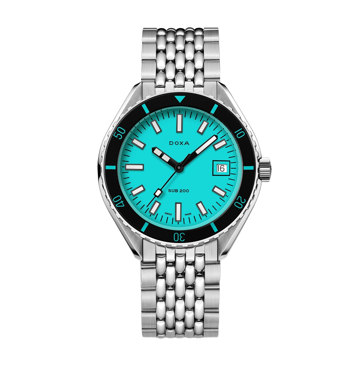 Erhältlich bei Juwelier Seilnacht in Freiburg: Die DOXA SUB 200 Aquamarine ist eine stilvolle Taucheruhr mit Retro-Charme und maritimer Frische. Ihr 42 mm großes Gehäuse aus satiniertem Edelstahl wird durch ein gewölbtes, entspiegeltes Saphirglas im Box-Design geschützt eine Hommage an die Originalmodelle der 1960er-Jahre.