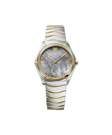 Die EBEL Sport Classic Damenuhr, erhältlich bei Juwelier Lachenmann, besticht durch ihr Gehäuse aus Edelstahl und 18K Gelbgold mit einem Durchmesser von 33 mm. Das graue Perlmuttzifferblatt ist mit applizierten römischen Ziffern und 8 Diamanten (0.052 ct.) verziert. Geschützt wird es durch innenseitig entspiegeltes Saphirglas. Das Wellengliederarmband aus Bicolor-Edelstahl mit Faltschließe ergänzt das elegante Design. Die Uhr wird von einem Schweizer Quarzwerk angetrieben und ist bis 5 bar wasserdicht.