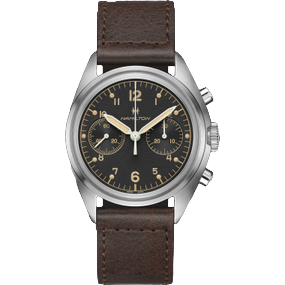 Der Khaki Pilot Pioneer Mechanical Chronograph, erhältlich bei Juwelier Seilnacht in Freiburg, vereint das Vintage-Militärdesign der 1970er-Jahre British Royal Air Force Chronographen. Diese robuste 40mm-Uhr wird vom exklusiven Handaufzugswerk H-51-Si angetrieben.