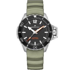 Die Khaki Navy Frogman Automatic, erhältlich bei Juwelier Seilnacht in Freiburg, ist Hamiltons technisch fortschrittlichste, wasserfeste Uhr. Ihr markanter Kronenschutz und das wellenförmige Kautschukarmband spiegeln die Kraft des Ozeans wider und betonen ihre Genauigkeit, Lesbarkeit und Robustheit.