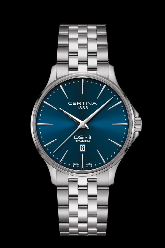 Die Certina DS-8?Gent?40?mm (Referenz?C045.410.44.041.00) kombiniert raffinierten Minimalismus mit urbaner Leichtigkeit. Das nur rund 8,35?mm flache Gehäuse besteht aus leichtem Titan, wiegt gerade einmal 80?g und liegt damit extrem angenehm am Handgelenk ideal für Alltag und Business Jeanslook gleichermaßen. Das Zifferblatt ist in einem tiefen Dunkelblau gehalten und wird durch silberfarbene Stabindexe und ebenso silberne Stunden-, Minuten- und Sekundenzeiger stilvoll kontrastiert. Eine Datumsanzeige bei 6?Uhr sorgt für klare Funktionalität ohne visuelle Unruhe. Certinas bewährtes “DS Concept” umfasst einen verstärkten, geschraubten Gehäuseboden, eine doppelt gedichtete Krone und ein entspiegeltes Saphirglas idealer Schutz gegen Kratzer und Wasser bis 10?bar (100?m).