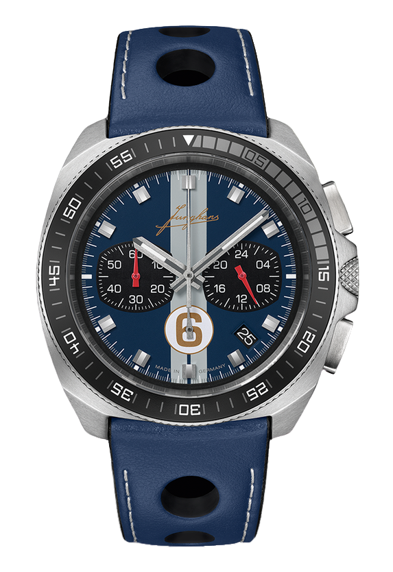 Erhältlich bei Juwelier Seilnacht in Freiburg: Die Junghans 1972 Chronoscope Sports Edition 2025 ist eine Hommage an die lange Tradition der Sportzeitmessung von Junghans. Das 43,3 mm große Edelstahlgehäuse mit einseitig arretierbarer Lünette beherbergt ein präzises Quarzwerk J645.83. Das blaue, matte Zifferblatt wird durch einen hellgrauen Doppelstreifen und den historischen Junghans-Schriftzug akzentuiert. Funktionen wie Datum, kleine Sekunde, 24-Stunden-Anzeige und Chronograph mit 1/5-Sekunden-Stoppfunktion unterstreichen die Funktionalität. Ein entspiegeltes Saphirglas schützt die Uhr, während der Edelstahlboden mit Editionsgravur die Limitierung auf 200 Exemplare hervorhebt. Das blaue Kalbslederarmband mit schwarzem Unterleder und Dornschließe sorgt für hohen Tragekomfort. Mit einer Wasserdichtigkeit bis 10 bar ist diese Uhr sowohl für sportliche Aktivitäten als auch für den Alltag bestens geeignet.