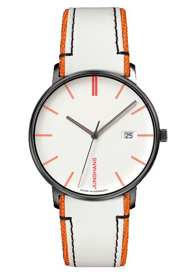 Erhältlich bei Juwelier Matthias Lewalter in Freiburg: Die Junghans FORM Quarz ist eine elegante Uhr, die modernes Design mit Funktionalität vereint. Das 39,9 mm große Edelstahlgehäuse mit schwarzer PVD-Beschichtung und einer Höhe von 7,0 mm beherbergt ein präzises Quarzwerk J645.37. Das mattweiße, schalenförmige Zifferblatt verfügt über Stundenindizes und Zeiger mit umweltfreundlicher Leuchtmasse, wobei die Zeiger in Rot gehalten sind und die Spitze des Sekundenzeigers mit roter Leuchtmasse akzentuiert ist. Ein entspiegeltes Saphirglas schützt die Uhr vor Kratzern. Das vegane Armband mit hellorangem Textil-Untermaterial und Edelstahl-Dornschließe bietet hohen Tragekomfort und lässt sich dank der Quick-Release-Funktion leicht austauschen. Mit einer Wasserdichtigkeit bis 5 bar ist die Junghans FORM Quarz der perfekte Begleiter für den Alltag.