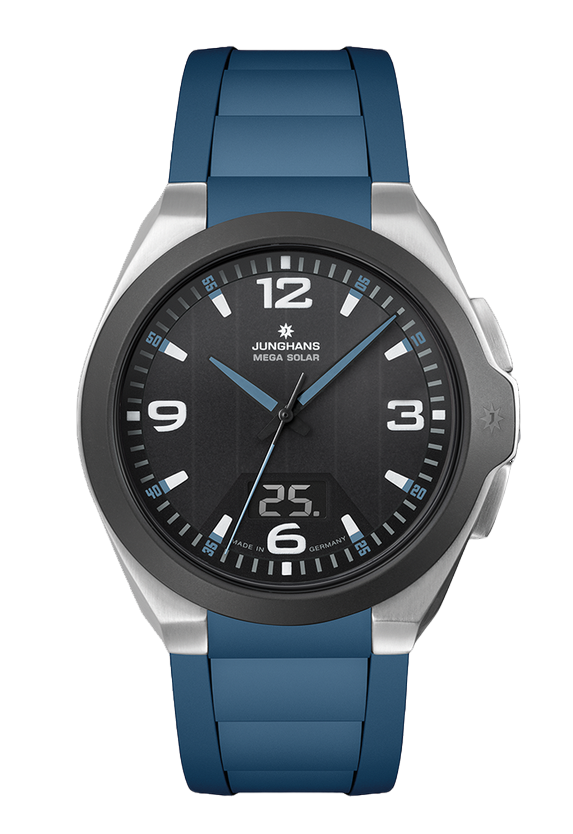 Die Junghans Spektrum Mega Solar (Ref.?18/1527.00) ist eine sportlich-elegante Funk-Solar-Uhr, die in jeder Situation präzise und umweltbewusst überzeugt. Das 41,6?mm große Gehäuse aus Edelstahl ist durch eine matte Keramiklünette ergänzt, die zusammen mit dem Saphirglas robusten Schutz bietet und bis 10?bar Wasserdichtigkeit sicherstellt.