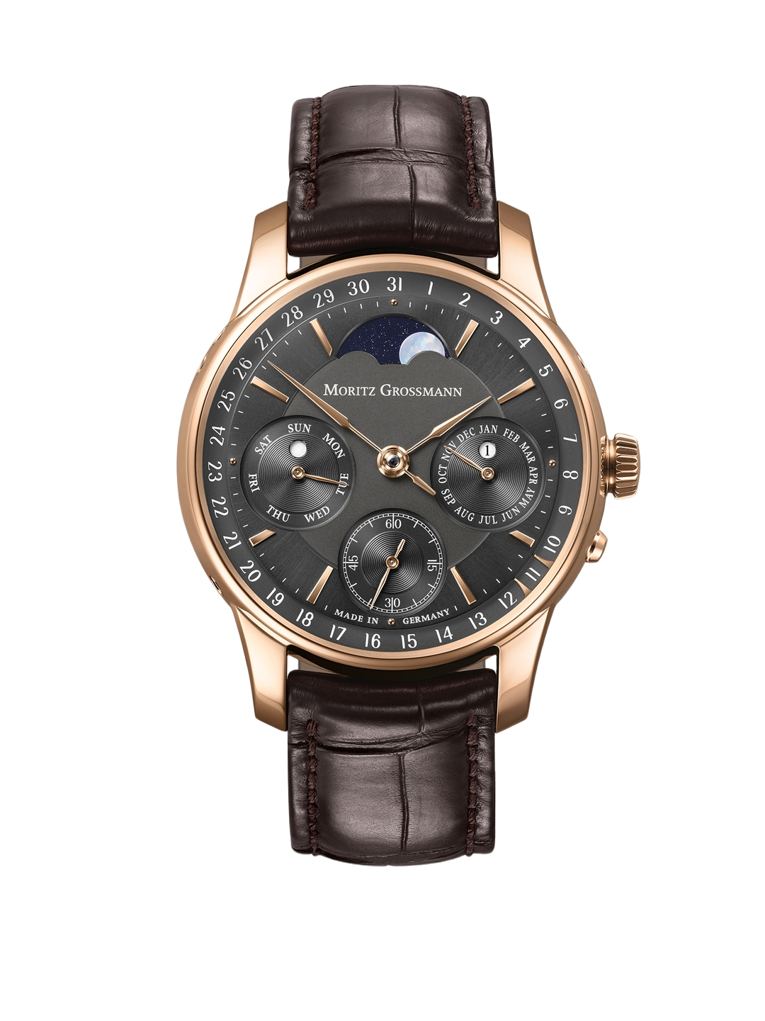 Kaliber: Stunde und Minute, kleine Sekunde mit Sekundenstopp, Datum, Wochentag, Monat, Mondphase, Grossmannscher Handaufzug mit Drücker