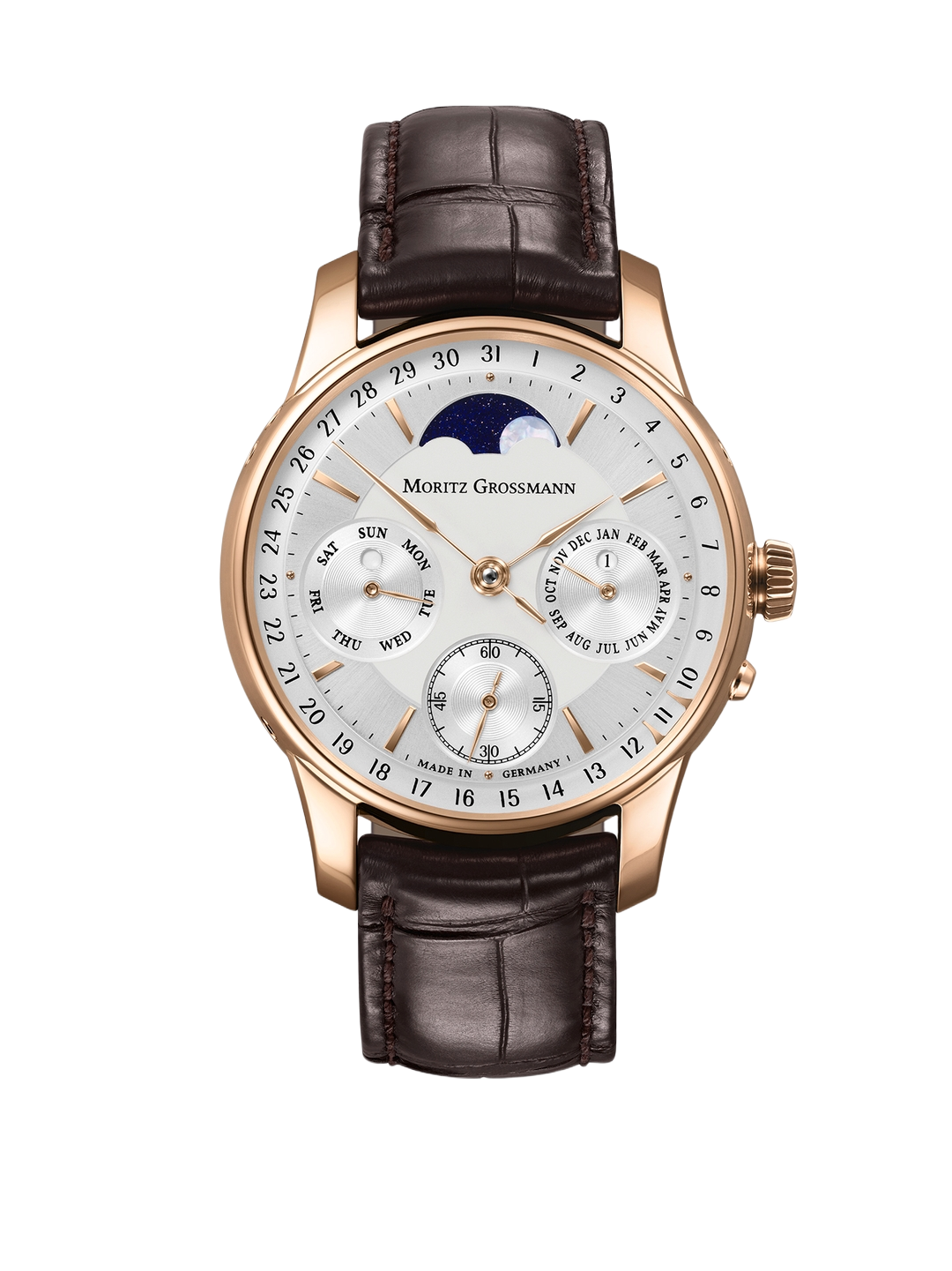 Kaliber: Stunde und Minute, kleine Sekunde mit Sekundenstopp, Datum, Wochentag, Monat, Mondphase, Grossmannscher Handaufzug mit Drücker