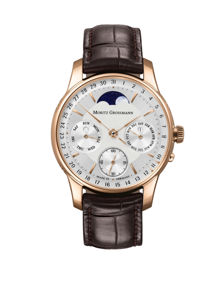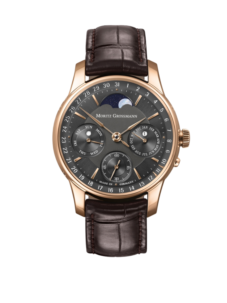 Das TOURBILLON Titan verbindet klassische Haute Horlogerie mit einer klar modernen Ästhetik. Das leichte, robuste Titan-Gehäuse mit seinem dunklen metallischen Glanz bildet den eleganten Rahmen für ein silbern schimmerndes grain dorge-guillochiertes Zifferblatt aus massivem Silber. Dezentrale Anzeigen für Stunden und Sekunden schaffen eine harmonische Symmetrie, während die von Hand gefertigten, braunviolett angelassenen Stahlzeiger die handwerkliche Tiefe der Glashütter Manufaktur unterstreichen. Im Zentrum steht das fliegend gelagerte Drei-Minuten-Tourbillon mit seinem großzügigen Durchmesser von 16 mm sichtbar platziert bei 6 Uhr. Das Manufakturkaliber 103.0 ist aufwändig finissiert, mit handgravierten Kloben, Glashütter Streifenschliff, dreifach gestuftem Sonnenschliff auf dem Sperrrad sowie weißen Saphir-Lagersteinen. Mit einer Gangreserve von 72 Stunden und dem charakteristischen Grossmannschen Handaufzug mit Drücker demonstriert dieses Modell sowohl technische Brillanz als auch höchste Uhrmacherkunst. Limitiert auf 12 Exemplare, getragen am schwarzen Alligatorlederband mit Titan-Faltschließe. Erhältlich bei Juwelier Seilnacht in Freiburg.
