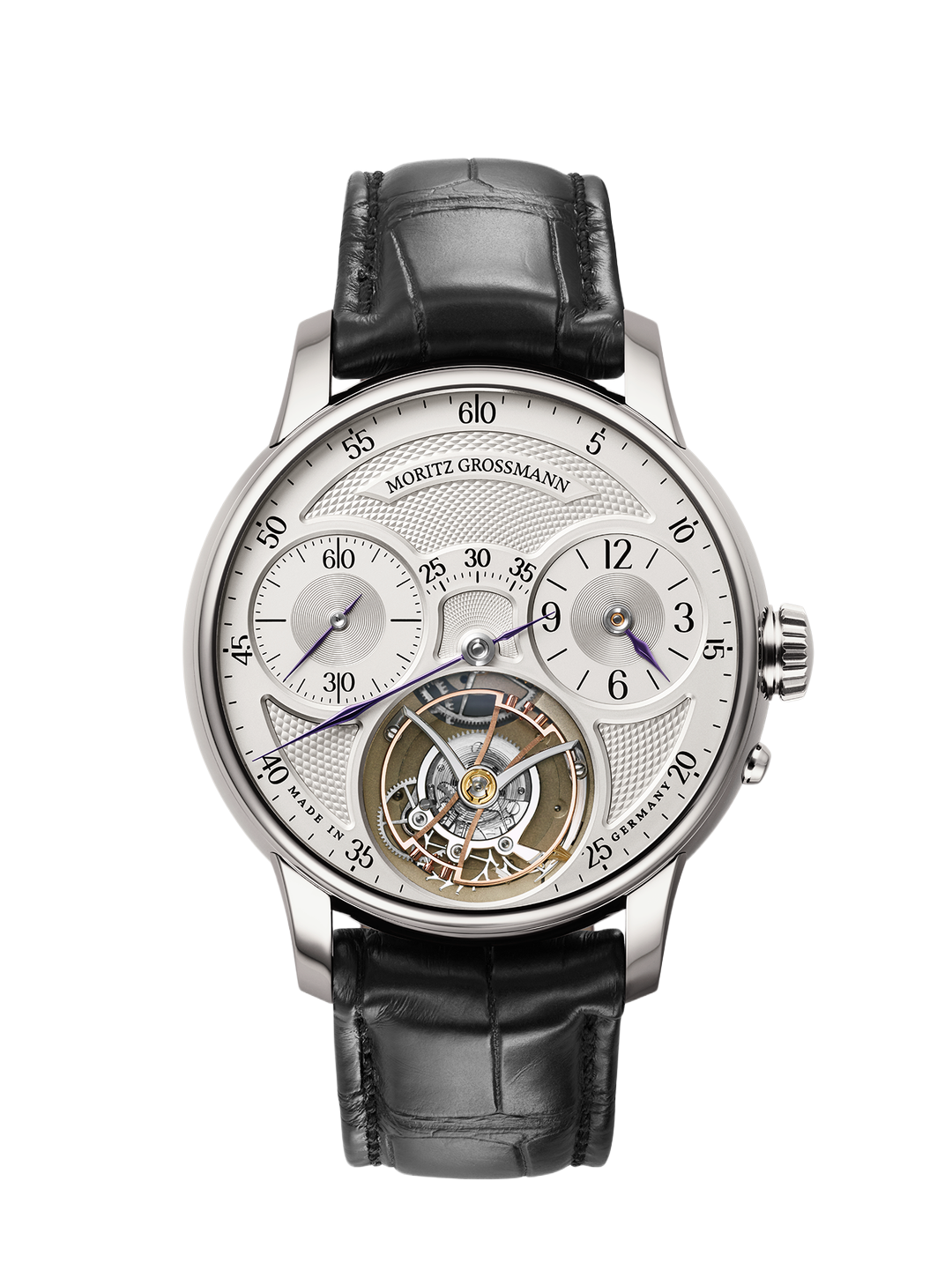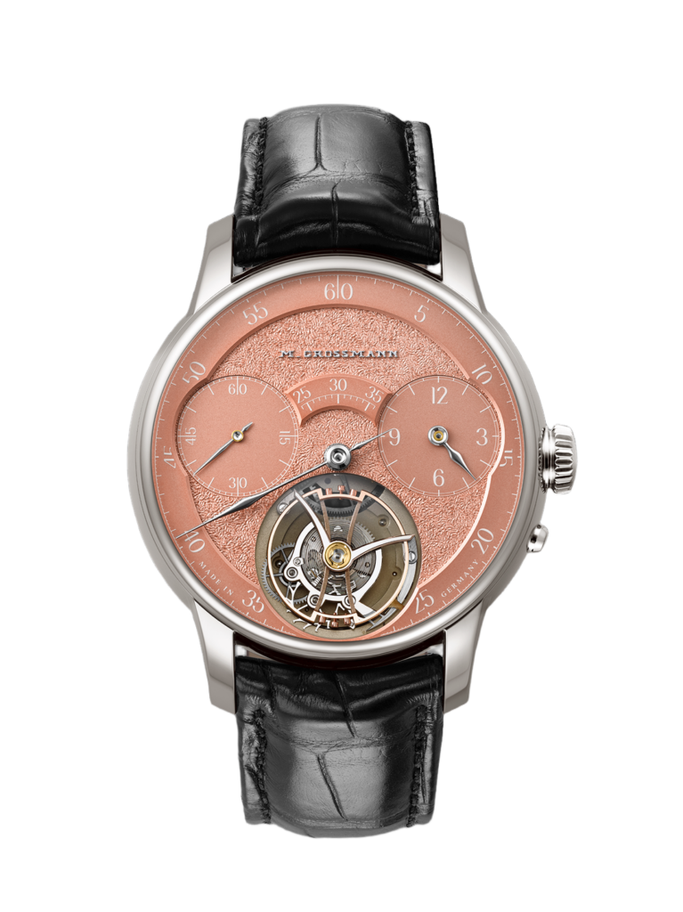 Kaliber: Fliegendes Drei-Minuten-Tourbillon mit patentierter Antriebsradverschraubung und V-förmiger Unruhbrücke. Zentralanzeige für Minuten, dezentrale Anzeige für Stunden und Sekundenstopp. Skalenlückenüberbrückung im Minutenzifferblatt von 25 bis 35 Minuten. Sekundenstopp durch Haarpinsel am Unruhreif. Ungleicharmige Ankerhemmung mit Gegengewicht. Grossmannsche Unruh mit untenliegender Spirale und Regulierung über Regulierschrauben. Neuartige Steinlagerung für das Federhaus. Laufwerksräder aus ARCAP. Handaufzug mit Drücker zur Zeigerstellung. Modifiziertes Glashütter Gesperr mit Rücklauf. Pfeilerwerk aus Neusilber mit handgravierten Elementen. Sonnenschliff und Streifenschliff für ästhetische Raffinesse. Goldchatons mit aufgesetzten Schrauben. Weiße Saphire als Lagersteine. Separat herausnehmbarer Kupplungsaufzug.