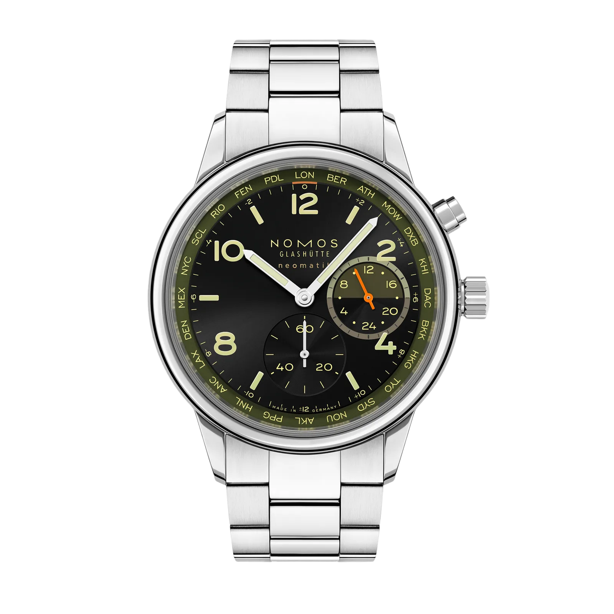 Die NOMOS Glashütte Club Sport neomatik Weltzeit Vector 790.S9 verbindet sportliche Robustheit mit der präzisen Weltzeitfunktion einer modernen Manufakturuhr. Das 40 mm große Edelstahlgehäuse mit entspiegeltem Saphirglas schützt ein markantes schwarzes Zifferblatt mit farbigen Akzenten und übersichtlicher Städtering-Anzeige, die das schnelle Ablesen verschiedener Zeitzonen ermöglicht. Im Inneren arbeitet das automatische Manufakturkaliber DUW 3202, das speziell für die flache Integration der Weltzeitfunktion entwickelt wurde. Die Zeitzonen lassen sich komfortabel über einen Drücker einstellen, während die 24-Stunden-Anzeige mit Tag-/Nacht-Indikation die Heimatzeit darstellt. Das hochwertige Metallband und die Wasserdichtigkeit bis 10 ATM machen die Uhr zu einem zuverlässigen Begleiter im Alltag und auf Reisen. Die auf 175 Exemplare limitierte Edition ist exklusiv erhältlich bei Juwelier Matthias Lewalter.