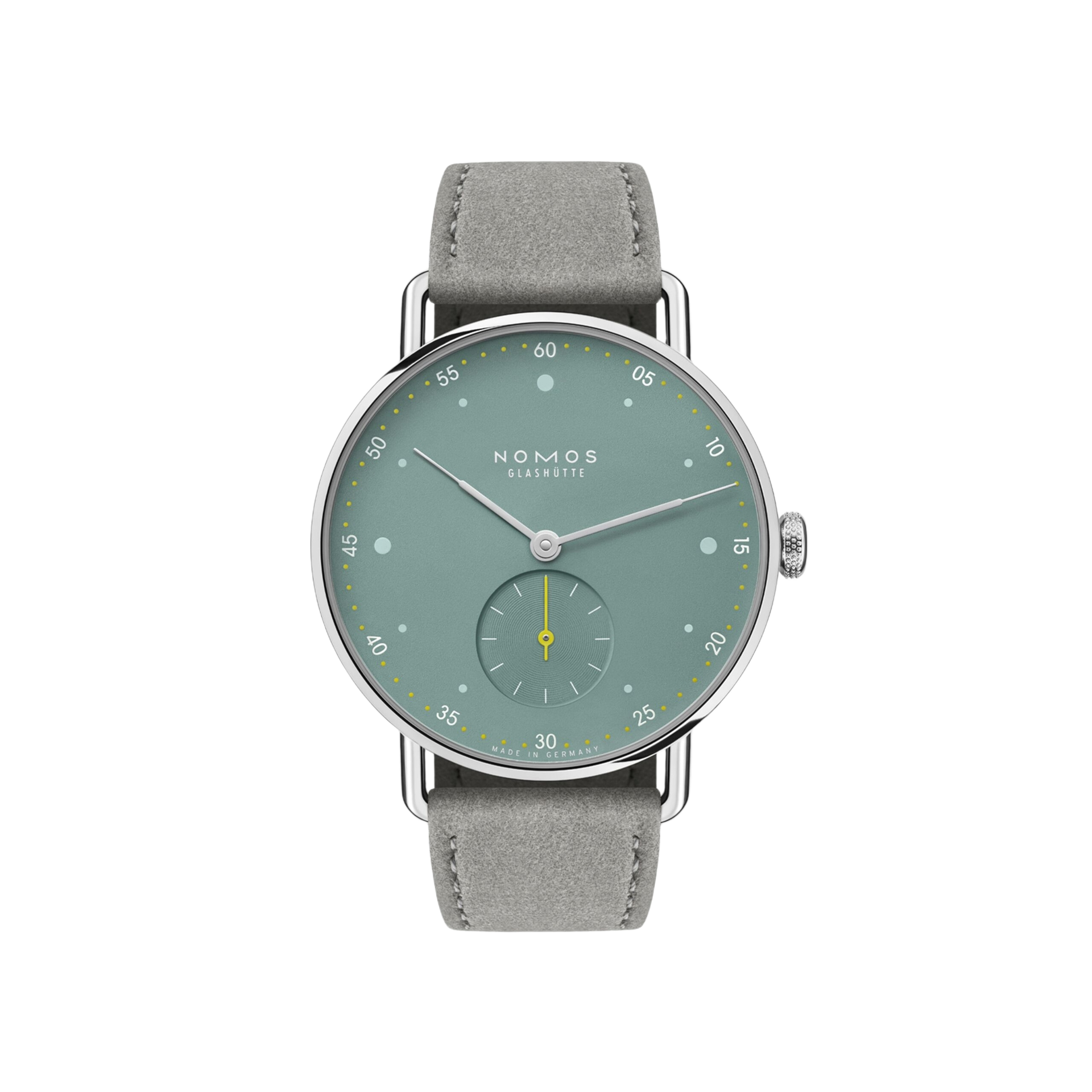 Das Zifferblatt in zartem Salbeigrün strahlt Ruhe und Individualität aus. Feine Minuterie, verspielte Rundungen und rhodinierte Zeiger unterstreichen den typischen Metro-Stil, der vom Berliner Designer Mark Braun entworfen wurde. Das gewölbte Saphirglas schützt das Zifferblatt elegant und zuverlässig.
