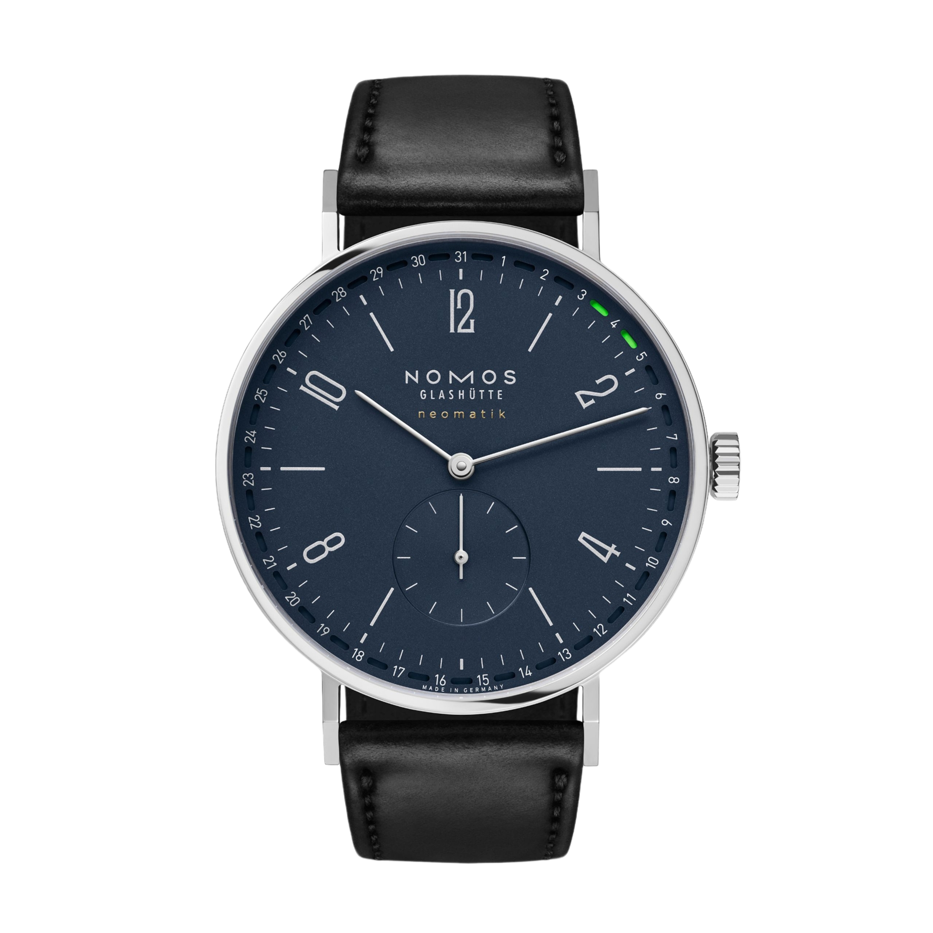 Der vielfach ausgezeichnete Klassiker Tangente zeigt sich hier als automatische Variante – flach wie eine Handaufzugsuhr und in vollendeter Proportion. Das tiefblaue Zifferblatt verleiht ihr Tiefe und Eleganz, während der Sekundenzeiger in leuchtendem Neonorange für einen modernen Akzent sorgt. Stunden- und Minutenzeiger glänzen silbern und unterstreichen die klare Ästhetik. Durch den Saphirglasboden zeigt sich das Automatikwerk DUW 6101 – das ultraflache NOMOS-Kaliber der neuen Generation, nur 3,2 Millimeter hoch.