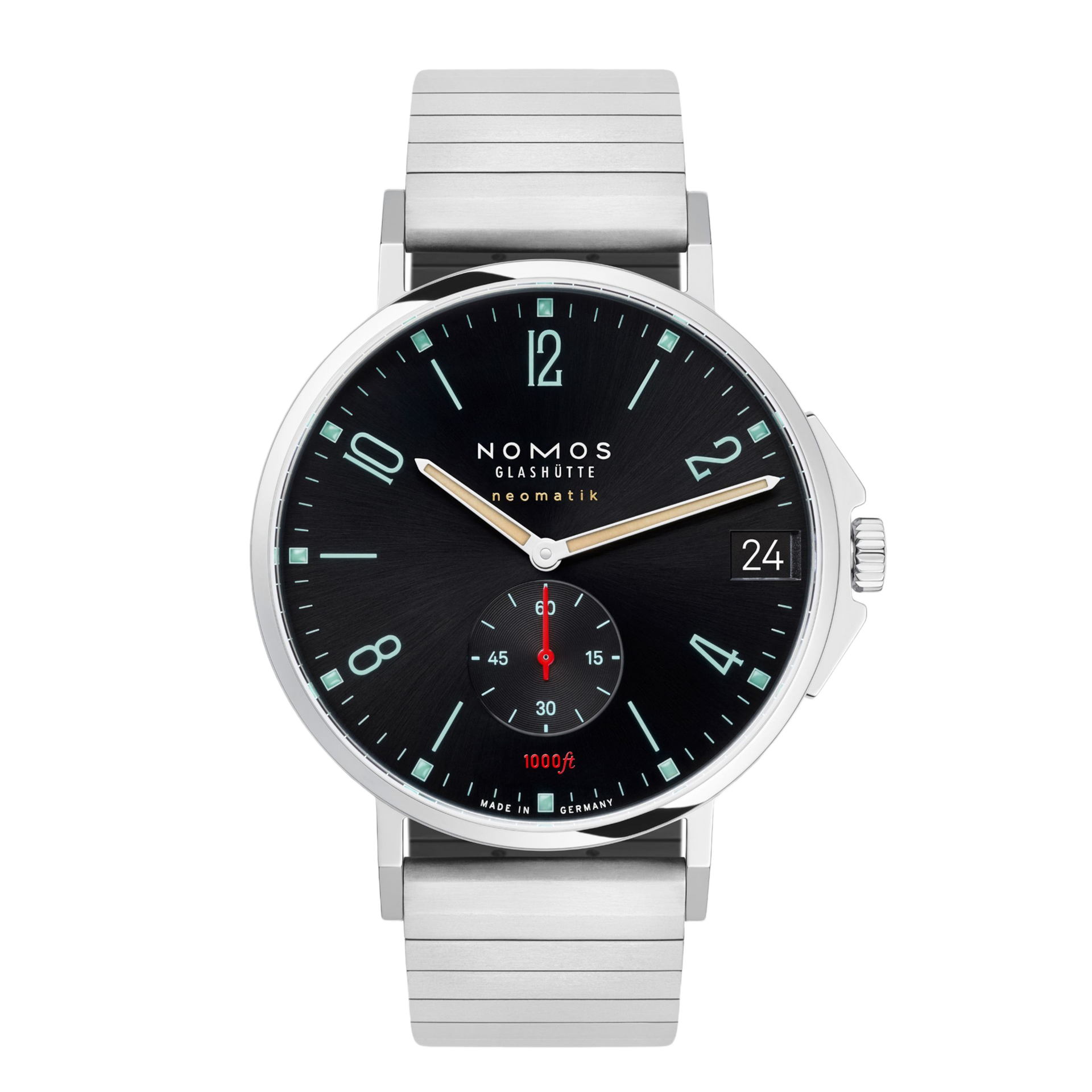 Kaliber: High-End-Mechanik aus Glashütte: das erste neomatik-Werk mit Datum, ein neuer Standard. NOMOS-Automatikkaliber neomatik Datum (DUW 6101) ist nicht nur sehr groß, sondern mit nur 3,6 Millimetern Höhe auch außergewöhnlich flach, denn dieses Werk wurde komplett neu konstruiert, das Datum wurde integriert.