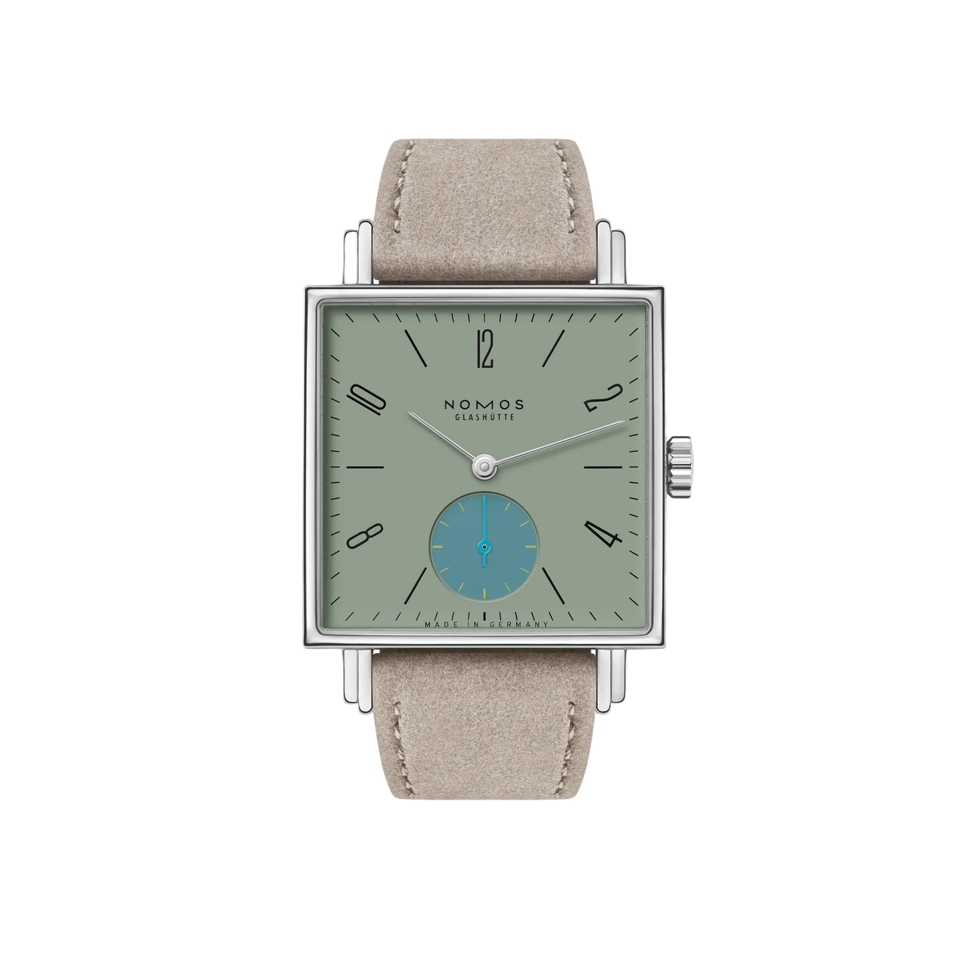 Erhältlich bei Juwelier Seilnacht in Freiburg: Die NOMOS Glashütte Tetra Salvia (Ref. 439) präsentiert sich als stilvoller, quadratischer Zeitmesser mit feinem Design und hoher mechanischer Qualität. Das Edelstahlgehäuse misst 29,5 × 29,5 mm und ist nur 6,5 mm hoch damit wirkt die Uhr elegant flach und komfortabel am Handgelenk. Das Zifferblatt besticht durch einen gedeckten Salbeigrün-Ton, der Ruhe und Stil ausstrahlt. Die kleine Sekunde bei 6 Uhr bringt mit Akzenten in Hellblau und Gelb eine frische Note ins Design. Stunden- und Minutenzeiger sind rhodiniert, wobei der Sekundenzeiger farblich abgesetzt ist ein subtiler Blickfang. Im Inneren arbeitet das hauseigene Handaufzugskaliber DUW 4001 mit NOMOS Swing System-Entwicklung, das eine Gangreserve von bis zu 53 Stunden bietet und durch einen Sichtboden bewundert werden kann. Die Uhr ist bis 5 ATM (ca. 50 Meter) wassergeschützt. Das beigefarbene Velourslederband (vegan) mit einer Anstoßbreite von 18 mm rundet das moderne Konzept ab. Die Tetra Salvia vereint minimalistisches Design, hochwertige Mechanik und dezente Farbakzente eine hervorragende Wahl für Stilbewusste, die Wert auf klare Formen und exakte Uhrmacherkunst legen.