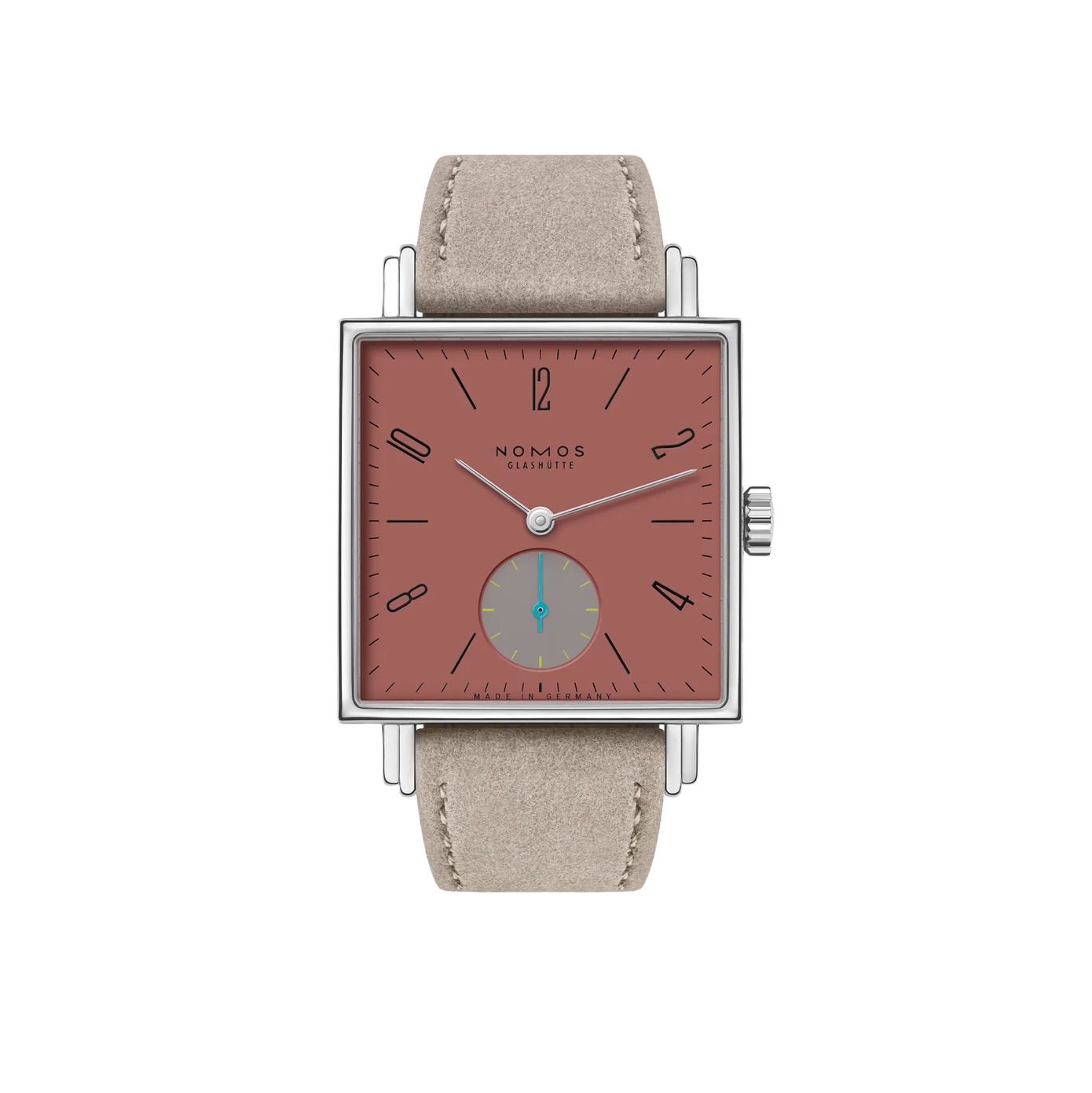 Das beigefarbene Velourslederband rundet das Erscheinungsbild ab und sorgt für ein weiches, elegantes Tragegefühl. Die Tetra Terra verbindet klare Formen, außergewöhnliche Farbgebung und höchste handwerkliche Qualität eine Uhr für Menschen mit Sinn für Design und Individualität.