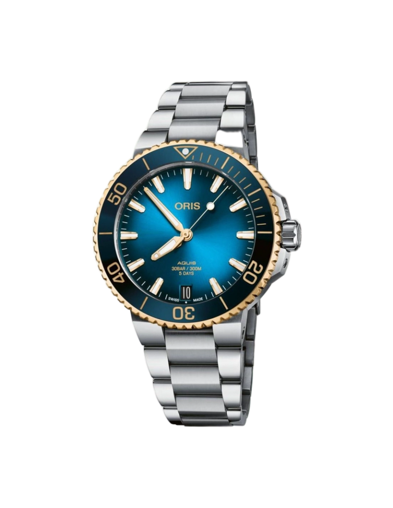 Die Oris Aquis Date Calibre 400 vereint modernes Design mit fortschrittlicher Uhrmacherkunst. Ihr 41,5-mm-Edelstahlgehäuse mit einer drehbaren Lünette aus 18 Karat Gelbgold und einem blauen Keramikeinsatz strahlt zeitlose Eleganz aus. Angetrieben vom hauseigenen Calibre 400, bietet sie eine beeindruckende Gangreserve von 120 Stunden und hohen Antimagnetismus. Mit einer Wasserdichtigkeit bis 30 bar und einem robusten Edelstahlarmband mit verlängerbarer Schließe ist sie der ideale Begleiter für Abenteuer über und unter Wasser. Entdecken Sie die Oris Aquis Date Calibre 400 bei Juwelier Seilnacht in Freiburg und erleben Sie Schweizer Präzision in Perfektion.