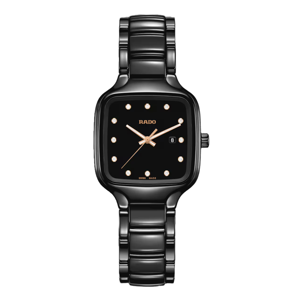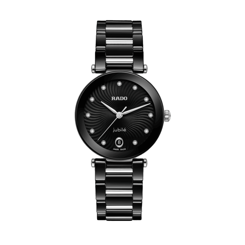 Das schwarze Zifferblatt setzt auf klare Minimalistik nur vier funkelnde Diamanten markieren die Positionen bei 3, 6, 9 und 12 Uhr, begleitet von schlanken, rhodinierten Zeigern und dem dezenten Jubilé-Schriftzug. Die Datumsanzeige bei 6 Uhr ist subtil integriert und sorgt für nützliche Funktionalität.