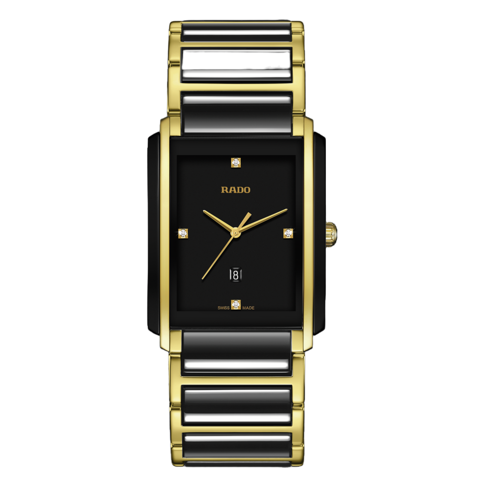 Erhältlich bei Juwelier Seilnacht in Freiburg: Die Rado Integral Diamonds (Referenz R20204712) ist eine elegante Dresswatch, die zeitloses Design mit innovativen Materialien verbindet. Das 31 mm große Gehäuse besteht aus schwarzer Hightech-Keramik und ist mit goldfarbenem PVD-beschichtetem Edelstahl eingefasst. Das rechteckige Zifferblatt in tiefem Schwarz wird durch vier Diamanten akzentuiert und verfügt über ein dezentes Datumsfenster bei 6 Uhr.