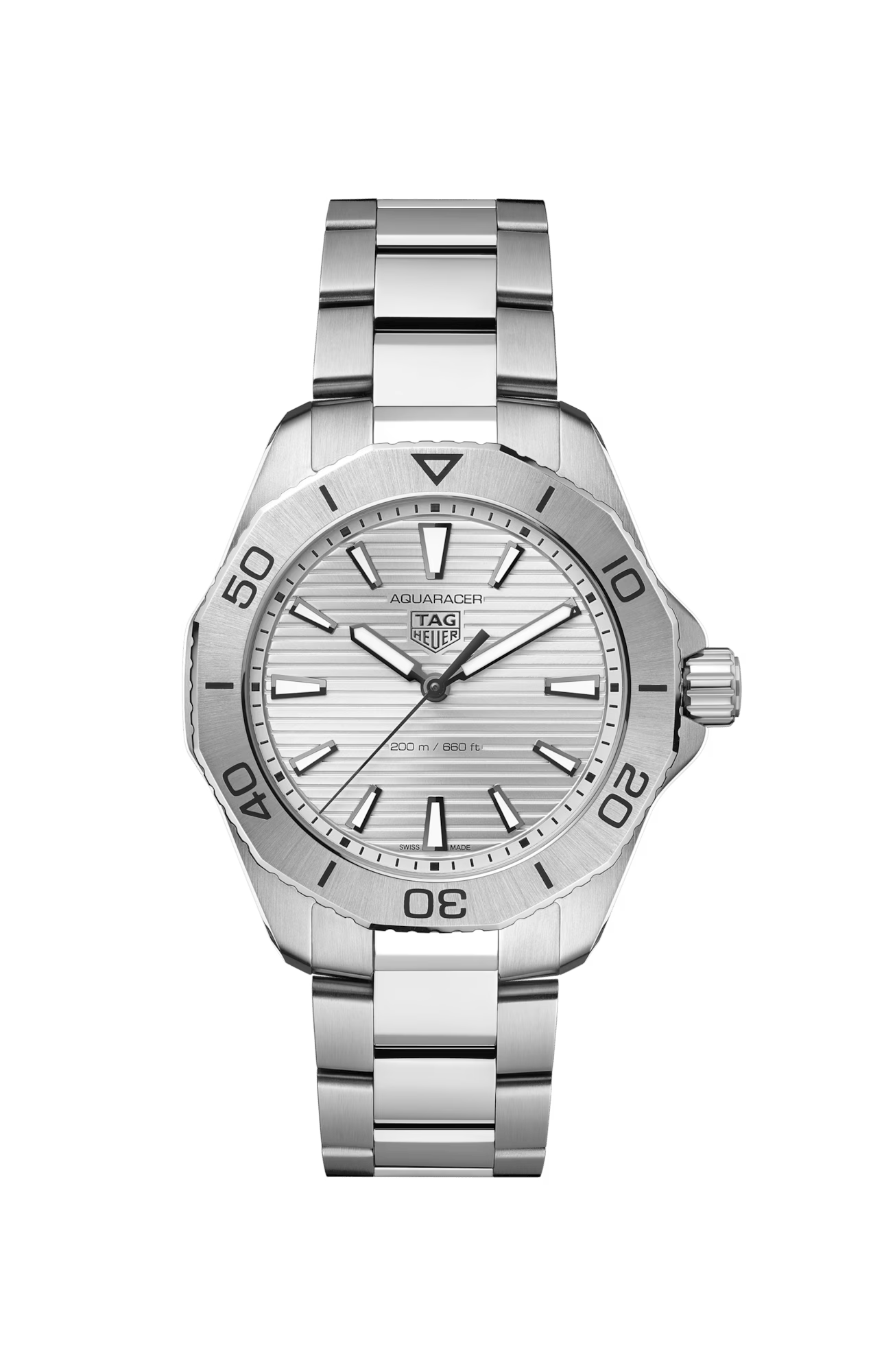 Erhältlich bei Juwelier Seilnacht in Freiburg: Die TAG Heuer Aquaracer Professional 200 Quarz 40 mm ist ein vielseitiger Zeitmesser, der für jede Herausforderung bereit ist. Das 40-mm-Edelstahlgehäuse mit gebürsteten und polierten Oberflächen bietet optimale Ergonomie und hochwertige Verarbeitung. Angetrieben von einem präzisen Schweizer Quarzwerk, ist diese Uhr bis 200 Meter wasserdicht und somit für extreme Bedingungen geeignet. Das silberne, gebürstete Zifferblatt mit Sonnenstrahleneffekt zeichnet sich durch ein markantes horizontales Muster aus, während schwarze Indizes und Zeiger für optimale Ablesbarkeit sorgen.