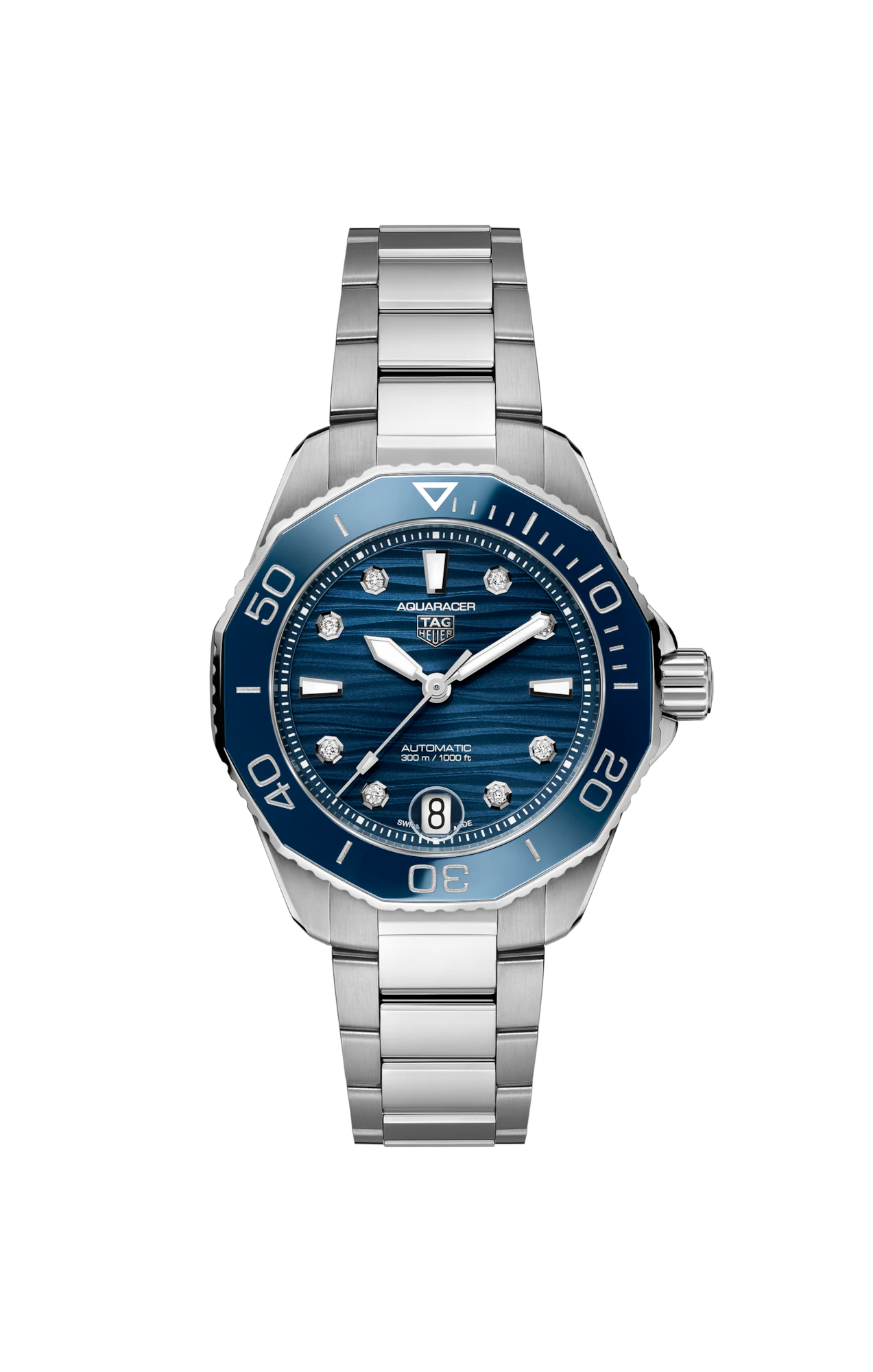 Erhältlich bei Juwelier Seilnacht in Freiburg: Die TAG Heuer Aquaracer Professional 300 Date Automatik 36 mm ist eine exquisite Taucheruhr, die sportliche Funktionalität mit luxuriöser Eleganz verbindet. Das 36 mm große Gehäuse aus fein gebürstetem und poliertem Edelstahl ist bis zu 300 Meter wasserdicht und somit für die tiefsten Meere gewappnet. Das blau lackierte Zifferblatt mit Wellenfinish wird durch 8 elegante VS-Diamanten (0,078 ct) akzentuiert, die der Uhr eine besondere Raffinesse verleihen.
