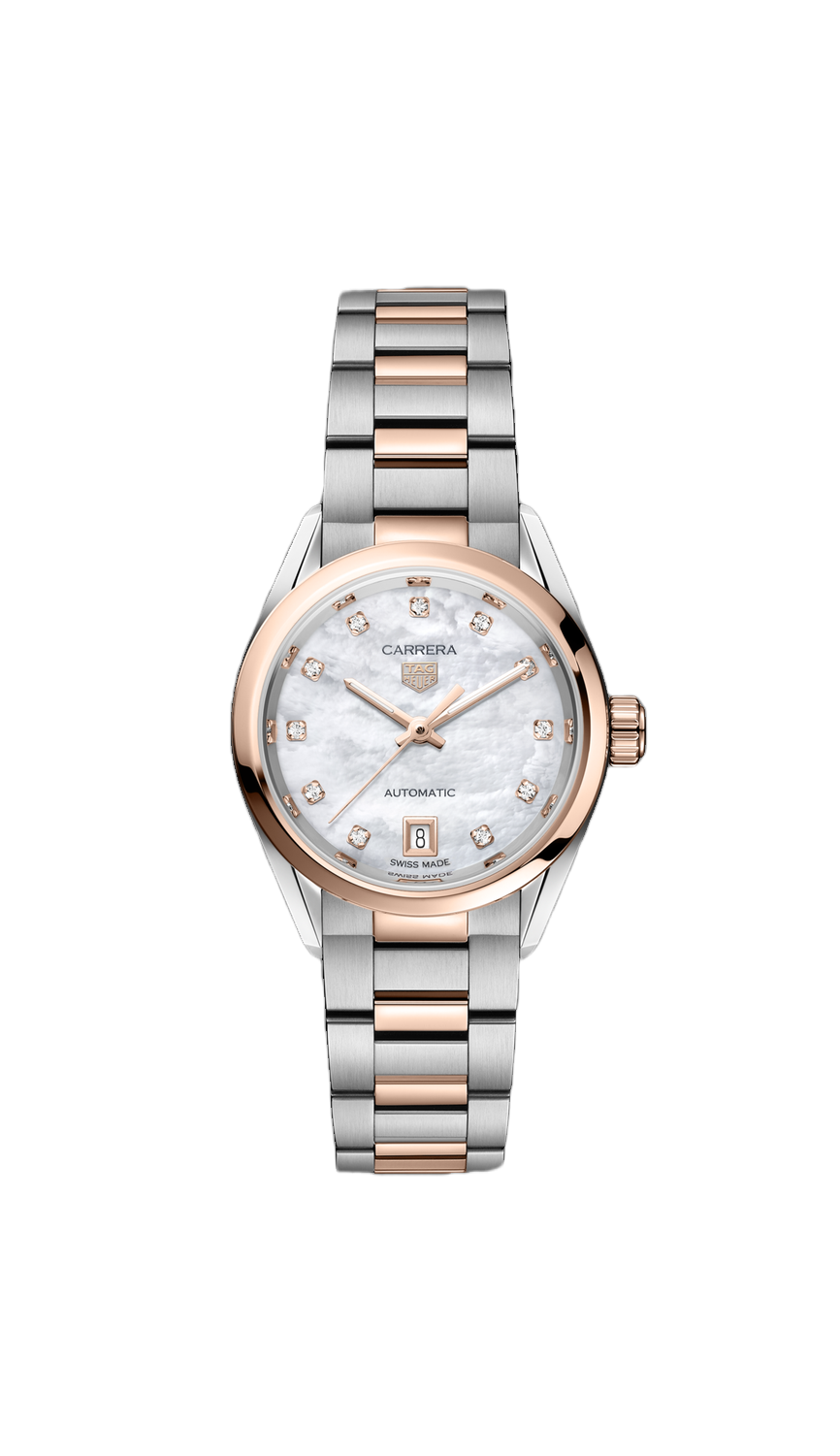 Erhältlich bei Juwelier Seilnacht in Freiburg: Die TAG Heuer Carrera Date Automatik 29 mm (Ref. WBN2450.BD0569) vereint zeitlose Eleganz mit feinster Schweizer Uhrmacherkunst. Das polierte Edelstahlgehäuse mit einem Durchmesser von 29 mm wird durch eine feststehende Lünette aus 18K 5N Roségold ergänzt, die der Uhr einen luxuriösen Akzent verleiht. Das Zifferblatt aus schimmerndem Perlmutt ist mit elf Diamantindizes (1,30 mm, 0,088 ct) besetzt und verfügt über eine Datumsanzeige bei 6 Uhr. Zeiger und Indizes sind mit Super-LumiNova® beschichtet, um auch bei schlechten Lichtverhältnissen optimale Ablesbarkeit zu gewährleisten.