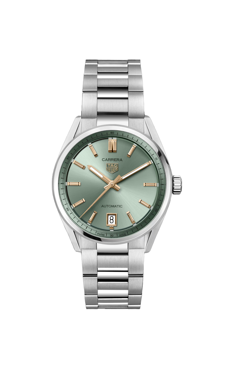 Erhältlich bei Juwelier Seilnacht in Freiburg: Die TAG?Heuer Carrera Date 36?mm (Ref.?WBN2312.BA0001) ist eine elegante Dreizeiger-Automatik, die urbane Stilsicherheit mit moderner Technik verbindet. Das schlanke Edelstahlgehäuse misst 36?mm im Durchmesser und ist nur 10,2?mm hoch, sodass es am Handgelenk selbstbewusst wirkt. Ein massives H-Glieder-Stahlband mit Sicherheitsfaltschließe sorgt für präzisen Tragekomfort. Das Herzstück ist ein apartes Pastellgrün mit Sonnenschliff auf dem Zifferblatt, das in Kombination mit 18K Roségold plattierten Zeigern, Indizes und Logo subtil luxuriöse Akzente setzt. Bei 6?Uhr fügt das Datumsfenster eine praktische Komponente hinzu, ohne das designäquilibrum zu stören. Angetrieben wird die Uhr vom robusten Automatikwerk Calibre 7, das eine Gangreserve von rund 50 Stunden bietet und mit Sichtboden bewundert werden kann ein Beweis für die hochwertige Glashütter Raffinesse im Inneren. Die Wasserdichtigkeit bis 50?m und das beidseitig entspiegelte Saphirglas machen sie alltagstauglich von Büro bis Freizeit. Mit ihrer ausgewogenen Kombination aus klarer Eleganz, tragbarem Komfort und zuverlässiger Automatikuhrtechnik verkörpert die Carrera Date 36?mm zeitlose Raffinesse perfekt für jeden Tag und stilvolle Auftritte gleichermaßen.
