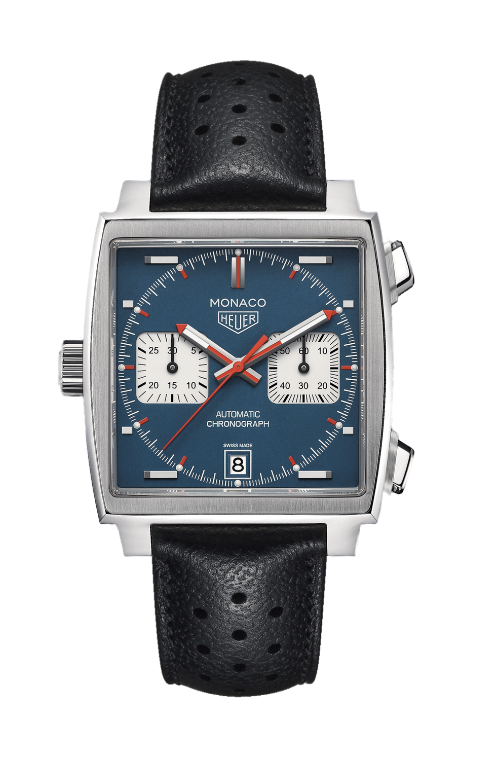 Das schwarze Kalbslederarmband mit spezieller Oberfläche, inspiriert vom Asphalt der Rennstrecke, sorgt für hohen Tragekomfort und betont den Motorsport-Charakter der Uhr. Mit einer Wasserdichtigkeit bis zu 100 Metern ist die TAG Heuer Monaco Chronograph Calibre 11 Automatik sowohl für den Alltag als auch für besondere Anlässe geeignet.