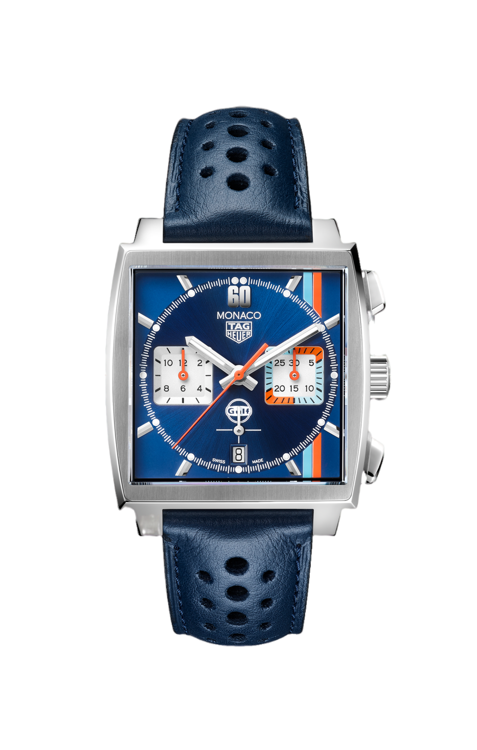 Das perforierte blaue Kalbslederarmband mit orangefarbener Innenauskleidung unterstreicht den sportlichen Charakter der Uhr. Mit einer Wasserdichtigkeit bis 100 Meter ist die TAG Heuer Monaco Chronograph x Gulf Special Edition der ideale Begleiter für den Alltag und besondere Anlässe.