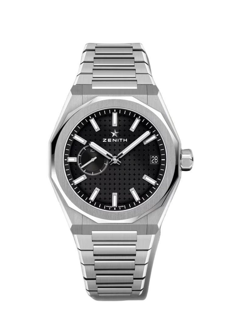 Erhältlich bei Juwelier Seilnacht in Freiburg: Die Zenith DEFY Skyline (Ref. 03.9300.3620/21.I001) ist eine markante Uhr, die modernes Design mit technischer Raffinesse verbindet. Das 41-mm-Edelstahlgehäuse mit achteckiger Form und facettierter Lünette verleiht der Uhr eine dynamische Ästhetik. Das schwarze Zifferblatt mit Sonnenschliff greift das emblematische vierzackige Sternmotiv von Zenith auf und sorgt für ein auffälliges Erscheinungsbild.